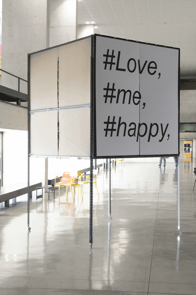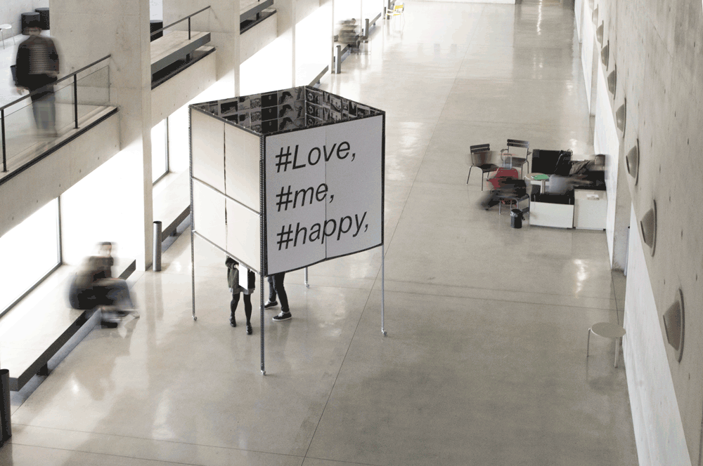 Una caja suspendida —llena de ideas— emerge en la Facultad de Comunicación (Universidad de Navarra, Pamplona) como pausa en medio del flujo. En su piel, cuatro palabras —#love, #me, #social, #follow— condensan la gramática del presente: etiquetas extraídas de los listados más usados que funcionan como espejo e interrogación. ¿Qué amamos?, ¿a quién nos mostramos?, ¿de qué comunidad dependemos?, ¿a dónde nos conduce seguir? Dentro, la fotografía recoge y contradice esas preguntas, tejiendo una meditación sobre deseo, identidad y pertenencia. La levitación separa la obra del suelo para convertirla en umbral: el vacío bajo la caja es tiempo para pensar. En el marco de la Olimpiada Filosófica, el “feed” se vuelve espacio y la imagen, conciencia.