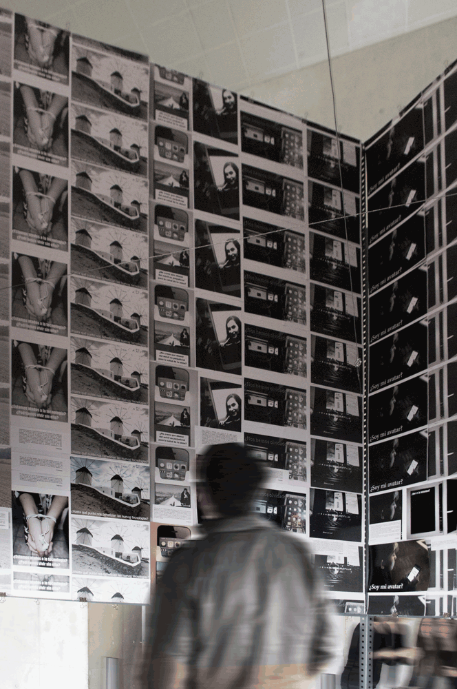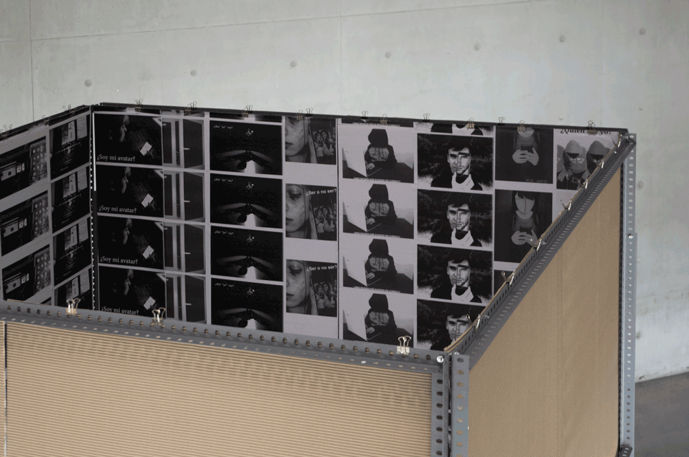 Para entrar hay que agacharse: un gesto mínimo, casi ritual, que altera la escala y cambia de mundo. El umbral acentúa el contraste entre la pureza luminosa del edificio de Nacho Vicens y la densidad íntima de nuestra caja, convertida en cámara oscura. Dentro, la deriva es del grano al píxel: lo físico se vuelve virtual. Las fotografías originales —de estudiantes de 2.º de Bachillerato— no se alinean como vitrina, sino que tejen una constelación de ideas. Su repetición en forma de carrete subraya el montaje: la imagen regresa, insiste, pulsa; y en ese ritmo se asienta la memoria.